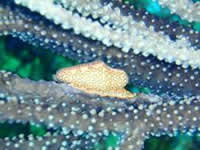 Since adults are dioecious and do not undergo a sex change, sexual reproduction occurs between adults when a male approaches a female and crawls up onto the right side of her shell. Here, the male extends a white tube under the edge of the female’s shell and begins mating. After up to 4 of hours of mating and four days, the female will lay encapsulated white translucent eggs onto the bare axis of gorgonians, which is exposed from the snail’s feedings. It is believed these areas are chosen since there is an absence of the gorgonian’s tissue toxins. Since each egg capsule contains multiple embryos (up to 300), a speckled appearance is demonstrated (Oceana, 2010). Even though oviposition occurs approximately during a lunar cycle, females have been known to lay several egg masses within a single cycle. After about ten days, the capsules hatch and the young free-swimming larvae disperse to live and feed on the plankton (Nahabedian et al, 2007). The larvae gradually metamorphose into juveniles, then adults.
