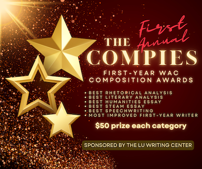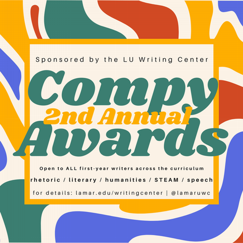 The Lamar University Writing Center is proud to host the first annual First-Year WAC Composition Awards! Open to first-year student nominees who are writing across the curriculum, The 2023 Compy Awards will present six winners with a $50 prize in the following categories: best rhetorical analysis, best literary analysis, best humanities essay, best STEAM essay, best speechwriting, and most improved first-year writer.