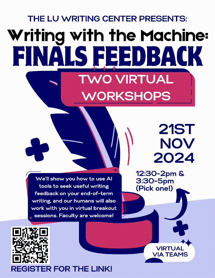 November 21, 2024 - This first-of-its-kind LU Writing Center workshop invites students and their teachers to a session for learning how to use AI tools to curate useful writing feedback and address it in conversation with human feedback from Writing Center coaches.