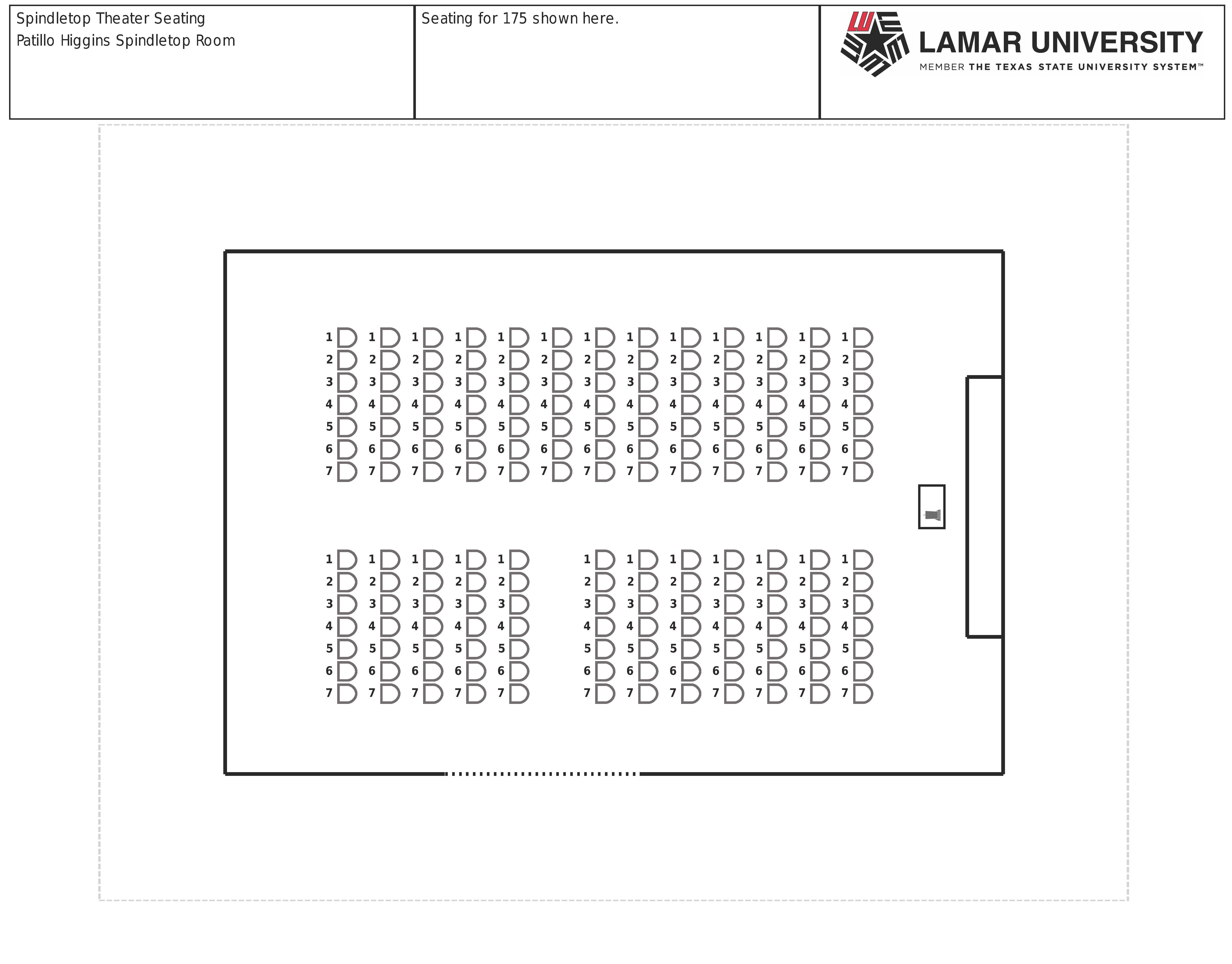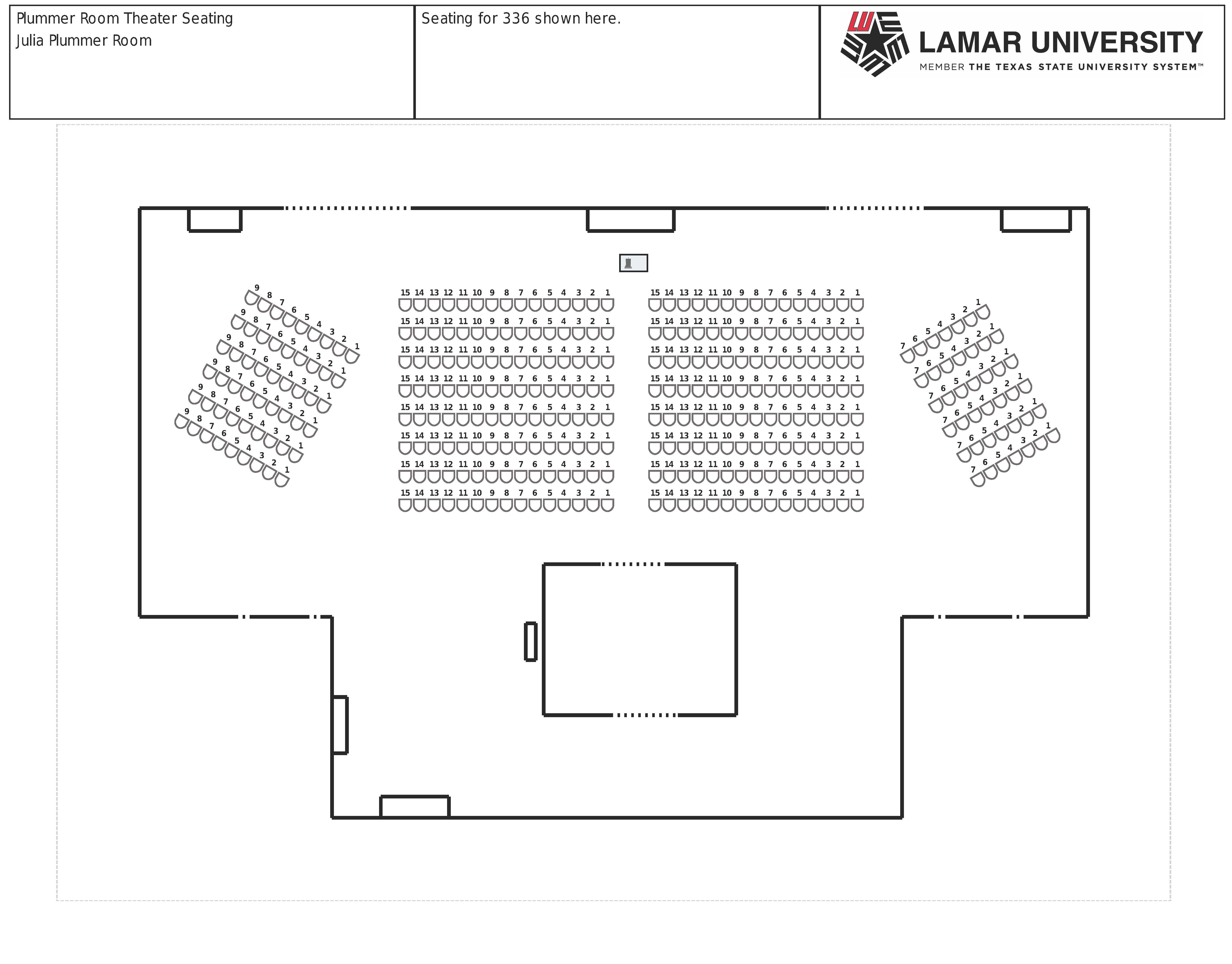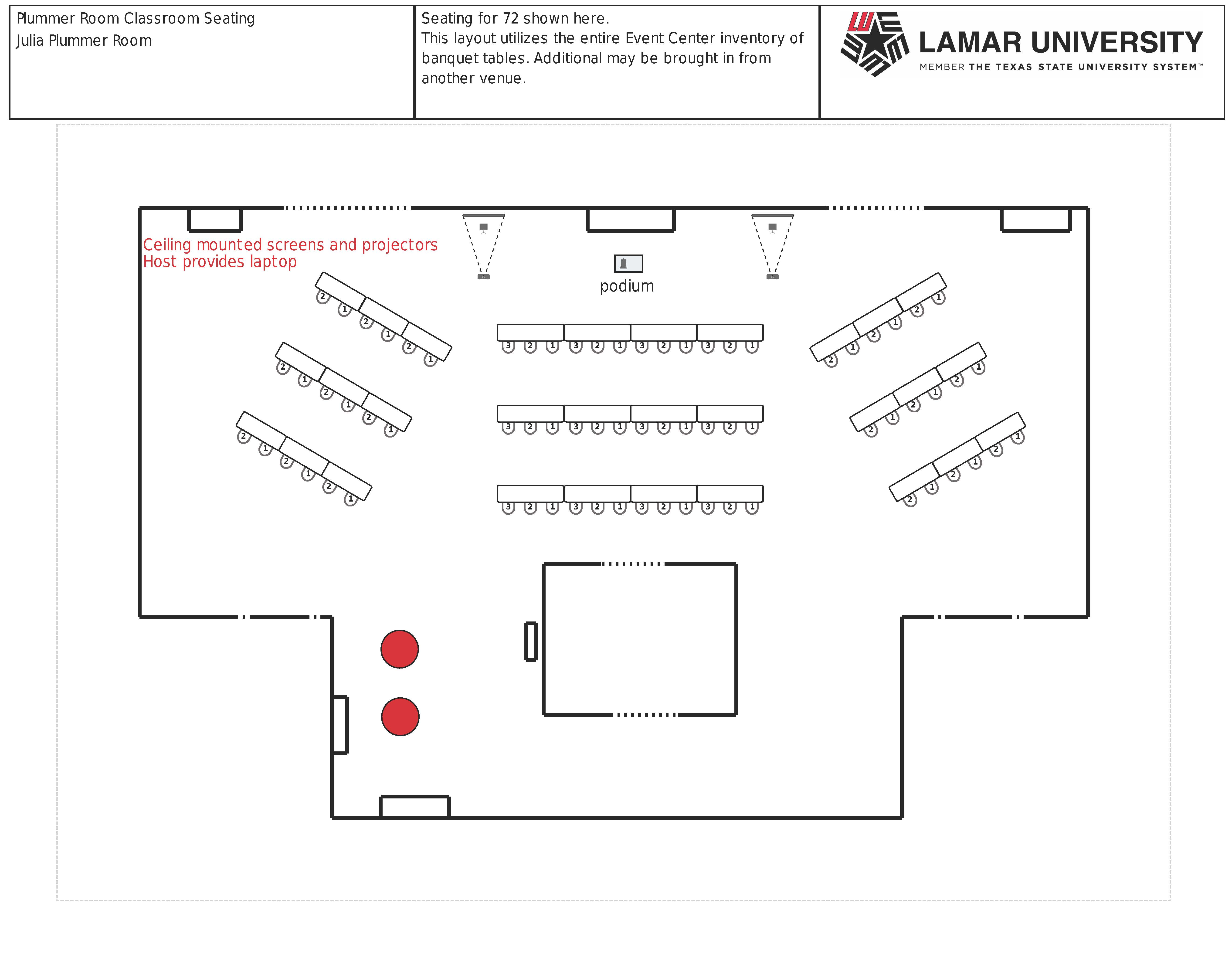 The following schematics illustrate the variety of options for setting up the rooms in the University Event Center. Please note that the examples shown below are intended only to illustrate setup styles- the number of seats or tables is not necessarily an accurate reflection of the Event Management inventory at a given time.