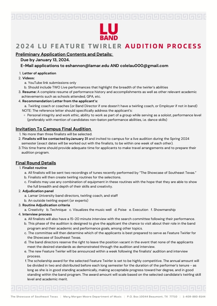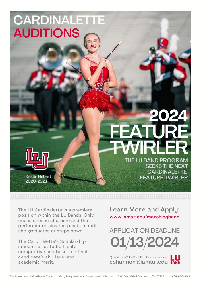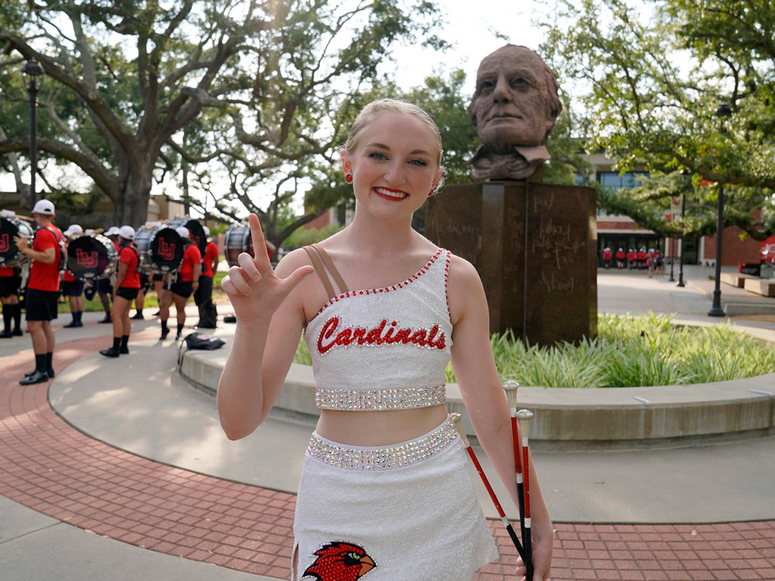 The Showcase features a highly exclusive role of "Feature Twirler." Feature twirlers are also known as "Cardinalettes." They are responsible for providing the Showcase with a dynamic visual flair and being first-class ambassadors for the University.