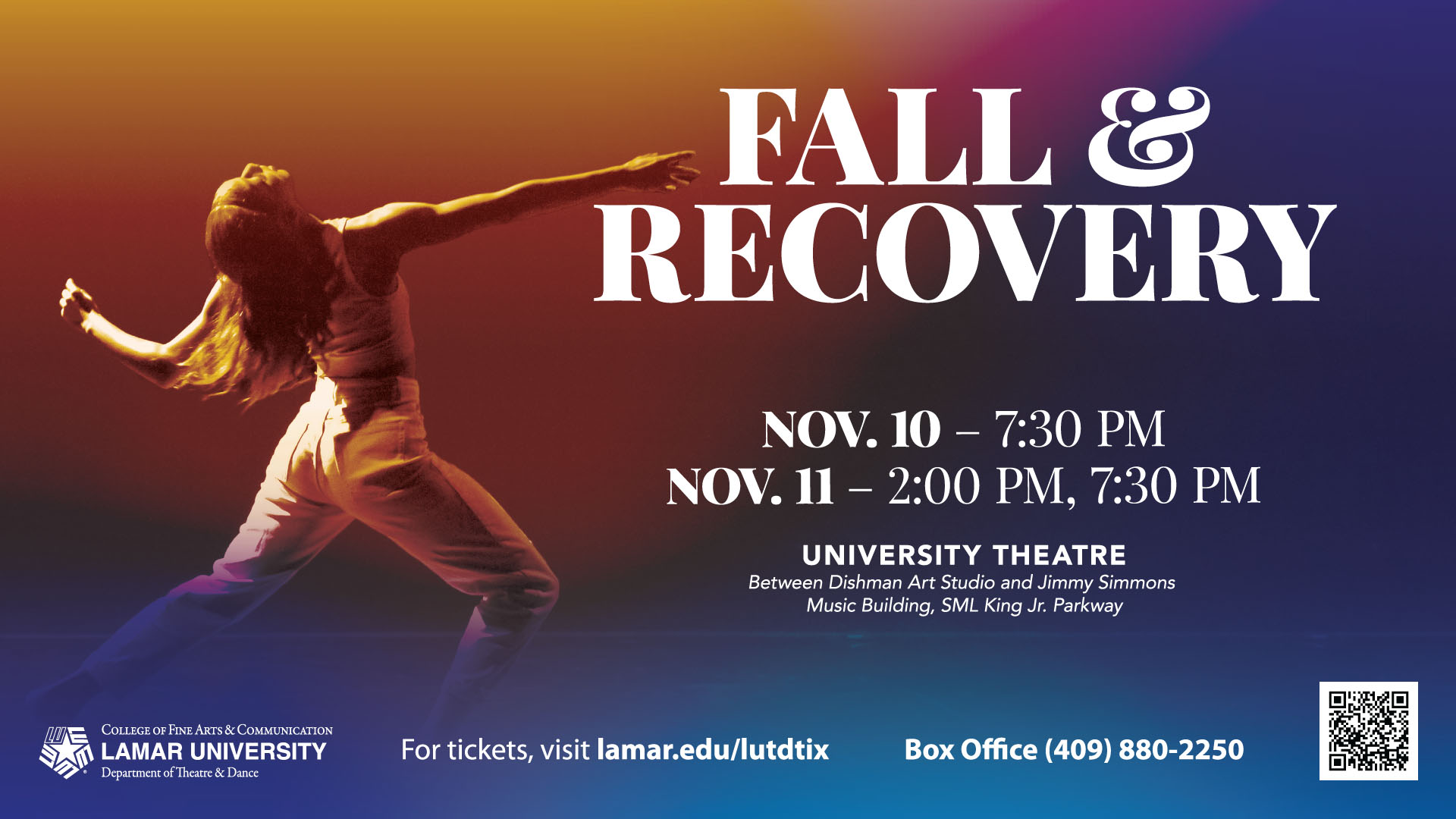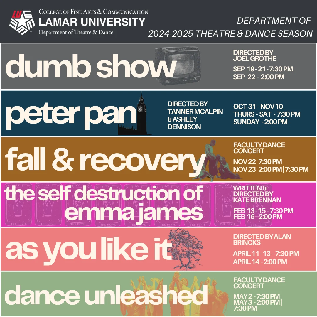 Mark your calendars and save your seats! The Lamar University Department of Theatre and Dance is proud to announce our 2025-2026 season. With a variety of performances from comedy to drama, from jazz to contemporary, there is something for everyone!
