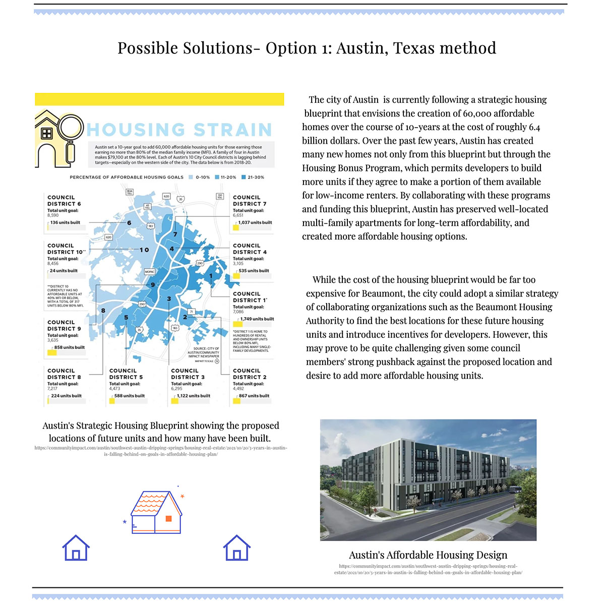 Analysis: By looking to three cities that have addressed the need for affordable housing, such as Austin, Houston, and New York City, Beaumont could then follow in these solution cities’ footsteps and gain the ability to provide future low-income renters with affordable housing options by encouraging developers with building incentives, collaborating with housing organizations and encouraging innovative housing construction.