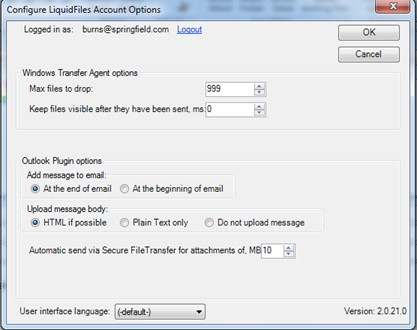 NOTE: that you only need to fill this in once and the LiquidFiles Outlook plugin will keep you logged until you’ve logged out of the plugin.