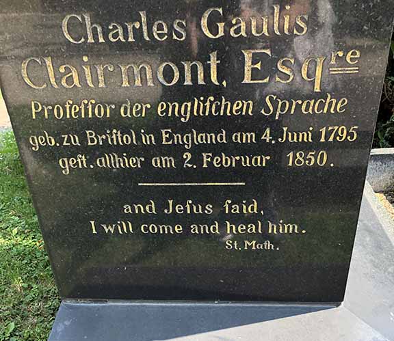 In 2018 when Joffe visited the Matzleinsdorf Cemetery in Vienna, Austria, she discovered that the Clairmont family tomb, likely containing the remains of Charles and definitely containing the remains of other Clairmont family members, was going to be demolished, the family bones reinterred in a communal grave and the tomb put up for sale.