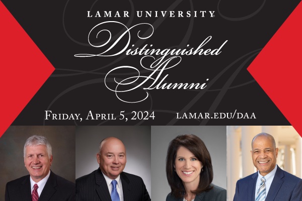 Read More ❯ March 04, 2024Lamar University announces the 2024 Distinguished Alumni Award recipients, recognizing graduates who have excelled in their careers and community service.