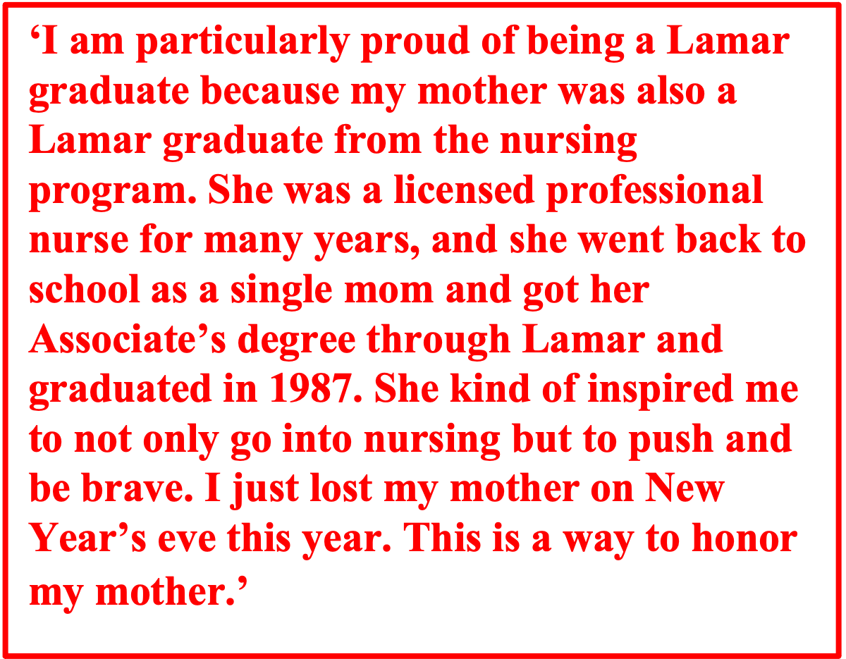 ‘I went to Lamar’s nursing program as an undergraduate. That paved my way into a career in nursing. Gave me a very good sound educational background. We have a great nursing program here at Lamar. I got a lot of knowledge and practical experience. I feel that I was kind of advanced compared to students from other nursing programs. As faculty, when I was hired in 2010, I really was honored to be a part of the faculty that I had such respect for as a nursing student. Even though it was many years later, that sense of respect and honor was still there and I was so proud to be able to be part of the faculty. Lamar Nursing program, although small compared to a lot of the big schools, we have the highest pass rates for the state of Texas. That’s a great honor for our department. Also, because I had so much respect for my nursing instructors, for me to be able to now pass that knowledge forward to the next generation of nurses just like they did, that itself is an honor. It has come full circle now. I got my Master’s and Ph.D. from Loyola University. For the last 12 years I worked with someone I did my undergraduate with, and now she has gone to LIT to start their nursing program. That is kind of neat. I went to school with her all those years ago, and now partnered with her on all those projects, and there are some other previous faculty that also graduated with me. It is kind of neat to be able to come back later and teach with them. We struggled so much as students and then to come back and collaborate with them as faculty is pretty neat.'