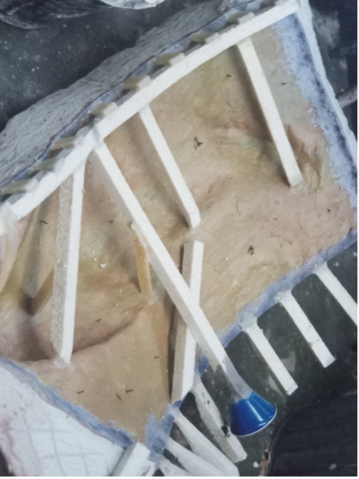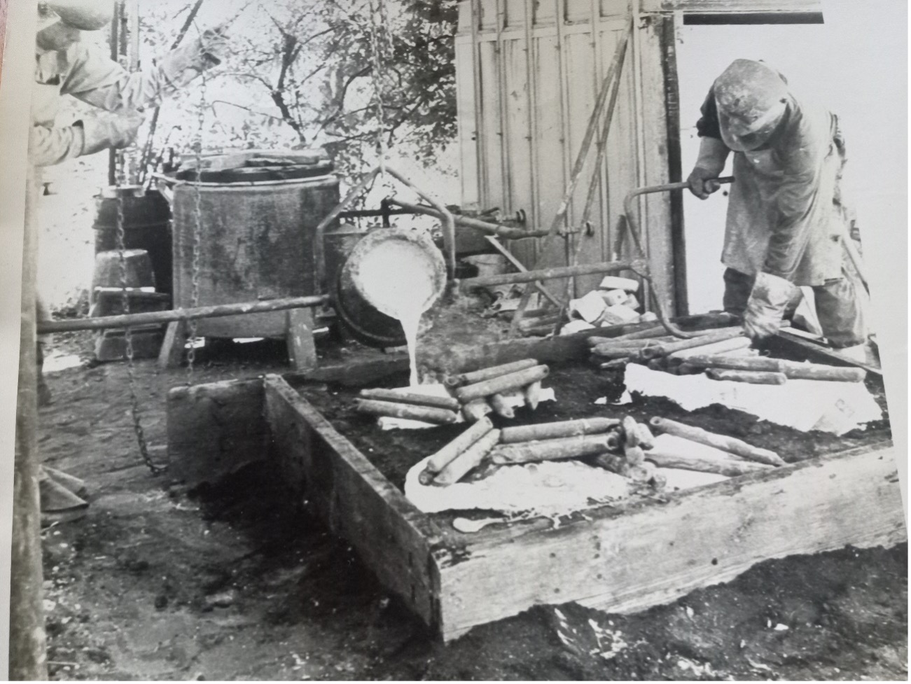 ‘It was a lot of work. Did it just over here at home. Inside this is a wax, which could be part of a piece, done in lot of pieces. Do you see the big square with figures on it? That is about how much metal I could pour in one pour…300 pounds. There are sections, the wax is the yellow part, and all of this is white, it is Styrofoam painted with wax. It burns out and makes a channel where the metal can pour in. It is hard to picture but all of this end up being a big blob of plaster with these being air vents. So, when the metal went into these however I had it. When you heat up the mold, you burn out all the Styrofoam in it. Styrofoam was my own way of doing it. …I grew up in the one-story brick house at the end of this block.