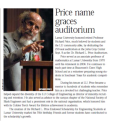 ‘I was in Columbus, Ohio at the time about to wrap up my PhD work there. The Dean of the College of Engineering, Lloyd Cherry, that building is named after him. He contacted what used to be my former barber, and he said he had heard about Dr. Price and would like to get in contact with him. So, he contacted my mother and she gave him my telephone number in Columbus and Dr. Cherry called me, very kind, very gracious. He was also in electrical engineering. And he asked if I would come for an interview. At that time Lamar was not even in my radar because at that time it was an all-white school. But Dr. Cherry was very warm even on the telephone and asked me if I would come in for an interview, which I agreed to and at that time I was interviewing I think upwards of 13 or 14 Universities. So, I came down not expecting that it would work out. Again, Dr. Cherry was very kind, very gracious. We went around and met the President at that time Dr. Thomas, and met the head of the Mathematics Department, Dr. Jeremiah, and all of these people were very warm. For dinner, they took me to a place on Port Arthur highway to a restaurant named Schooner (it is still around)….We made a decision to come to Lamar.’