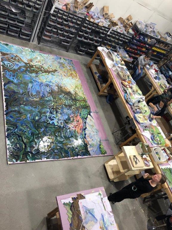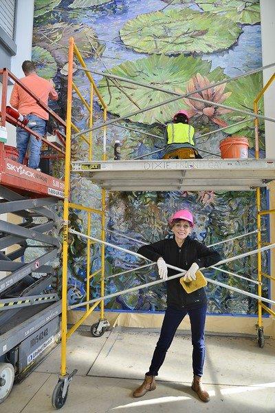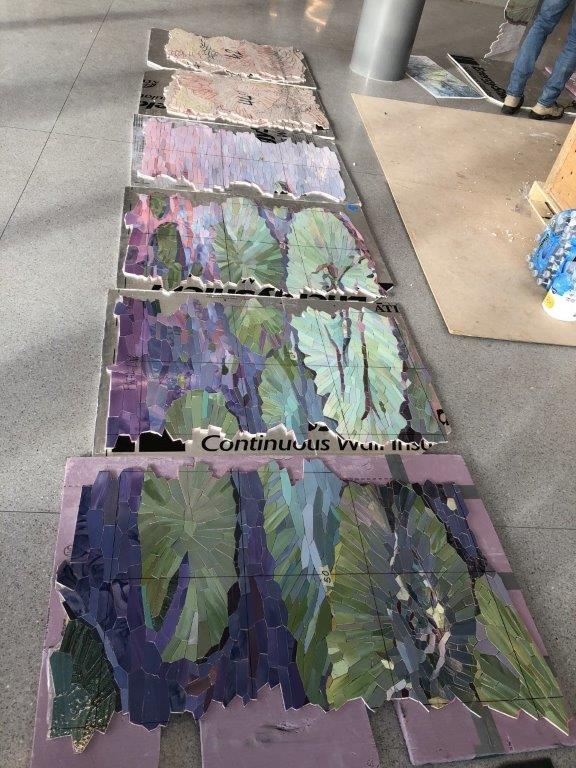 The process to create a mural like this is a long one. Dixie Friend Gay starts with a painting which is sent to her fabricators in Montreal several months prior to installation. The fabricators spend several weeks creating hand-glazed tiles to match the colors in the painting. The painting is photographically reproduced and enlarged to the exact size of the mural. The image is covered with a sticky, clear plastic sheet upon which the artisans cut and lay the individual pieces of tile to match the colors, shapes and patterns of the design. When all the pieces are in place and approved by Friend Gay, another clear plastic sheet is placed over the tiles to hold them in position. The entire mural is then cut into sections approximately 3’ x 2’ and placed into a container for shipping.