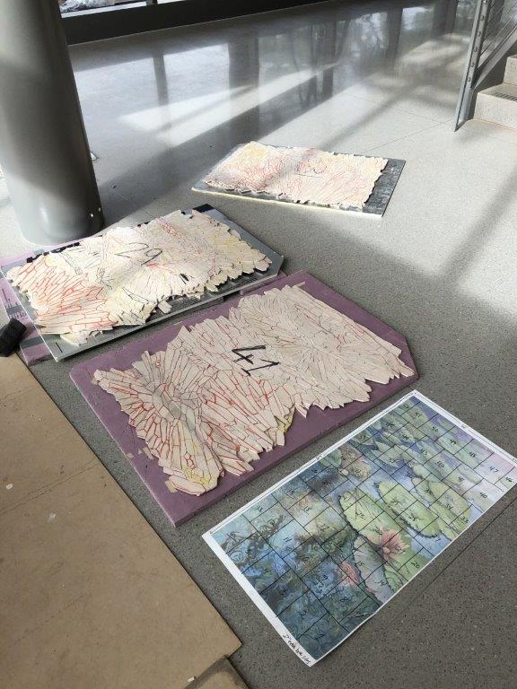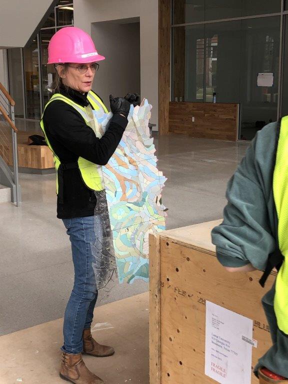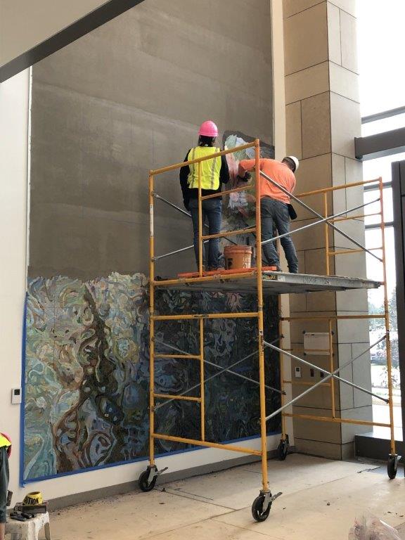 Dixie Friend Gay and two members of the Montreal team spent five days on campus installing the mural. They followed a “key map” and attached each of the 52 sections to the wall from right to left, bottom to top. As each row was finished and the thin set backing had dried, the outer plastic coating was removed. Once completely dried in and secured to the wall, five different colors of grout were applied to bind the individual tile pieces together.