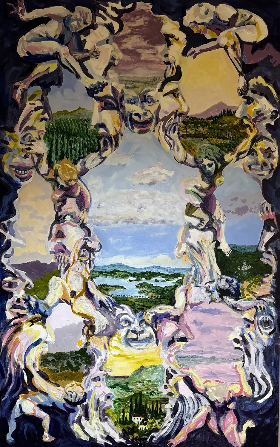 “Grotesquery with Nine Landscapes” is an excellent example of Earl Staley at his best. It was painted in Italy after Staley received the coveted Prix de Rome prize in 1981. European influence is evident in the twisting statuesque figures of nymphs and cupids and in the landscape elements of hills, cypress trees and villas. Grotesquery means distortion, unnaturalness or ugliness, and in art, this type of imagery is frequently found in theatrical settings. The painting has an unusual composition in that each of the nine disparate landscapes is segmented into small sections framed by columns of contorted figures. The bold, loose brushstrokes and luscious colors of purples, pinks and greens are classic Staley.