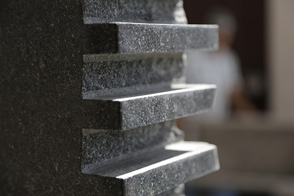 This sculpture is called “Musical Stele” because it is made from a rare black granite that actually has musical properties. Though touching is not encouraged, a very gentle brushing of the fingers over the delicate fins will create musical tones that vary depending on the length of the fin. Stele is a term used for an upright stone slab that served as a monument or marker in ancient times.