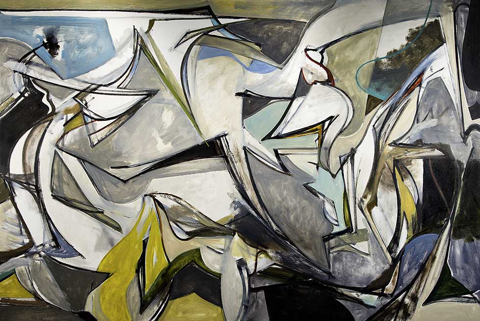 Kennaugh's paintings have a lyrical, spontaneous quality about them, which makes it surprising to learn that the works are carefully planned with meticulous drawings and explorations of color. The paintings are not direct copies of the drawings, however. As Kennaugh paints, the curved lines and muted colors evolve during the process to become something fresh and different.