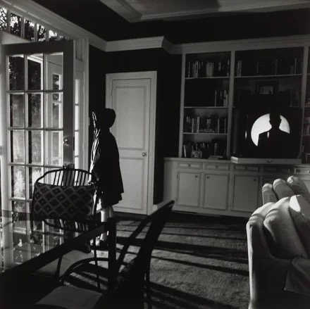 In this mysterious photo, a young girl in a hooded coat stands in profile at an open glass paned doorway of a library or study. Light streams in from an unidentified source illuminating the interior of the darkened room and elongating shadows across the floor. To the right is a television set with the head and shoulders of a male figure silhouetted in a round circle of light. The setting brings to mind a science fiction or horror movie where an innocent character has opened the door to an alien or monster. The use of black and white film accentuates the contrasts between light and dark and adds to the sense of uneasiness. Nicosia leaves the interpretation entirely up to the viewer.