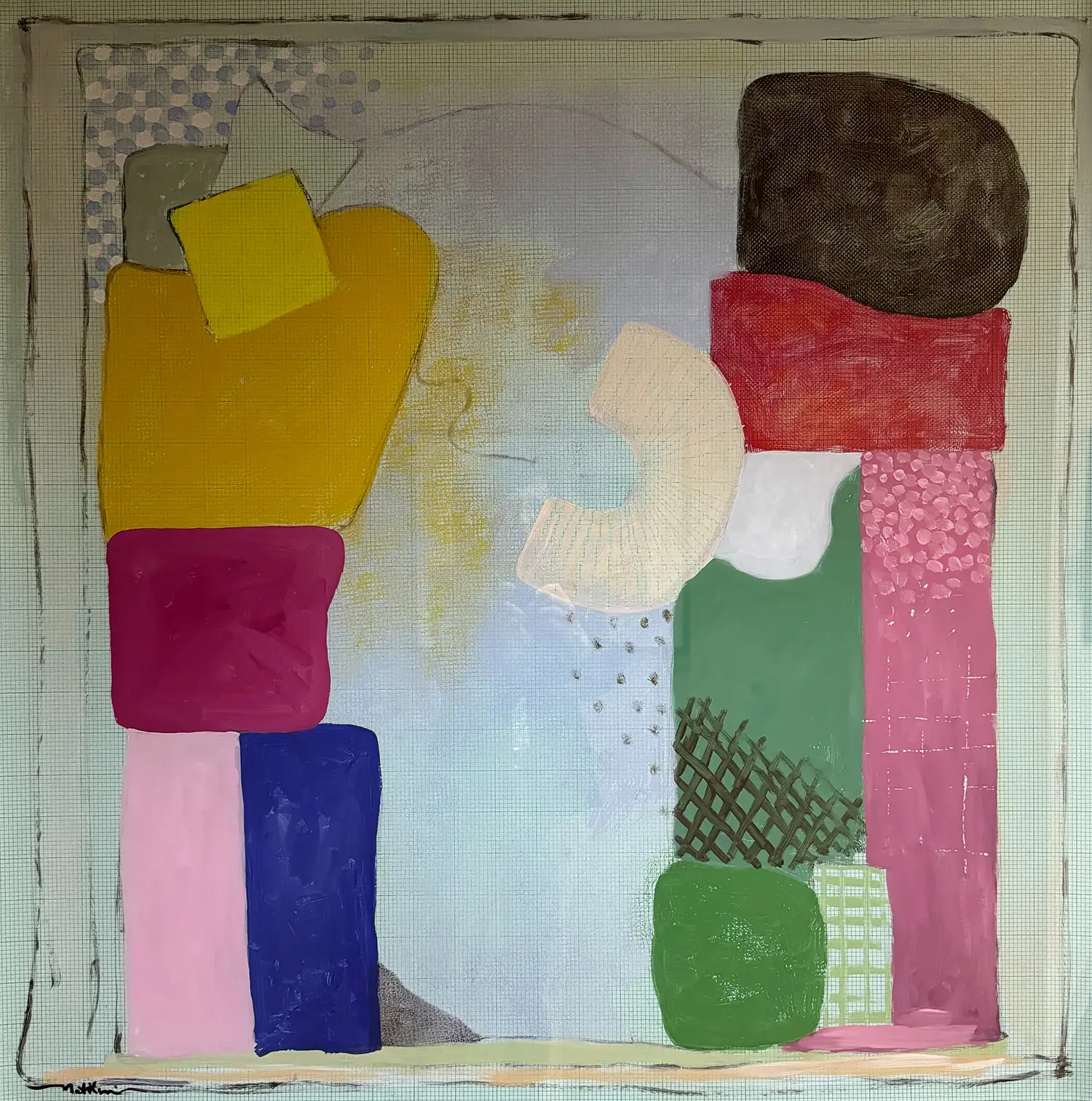 This work is a classic example of Natkin’s Hitchcock series. Painted on a massive sheet of graph paper, it contains his signature grid, dots, whimsical mark making and blocks of color. It could almost be interpreted as two abstracted human forms engaged in conversation. The colors are bright and playful giving the overall painting a sense of lighthearted joy.