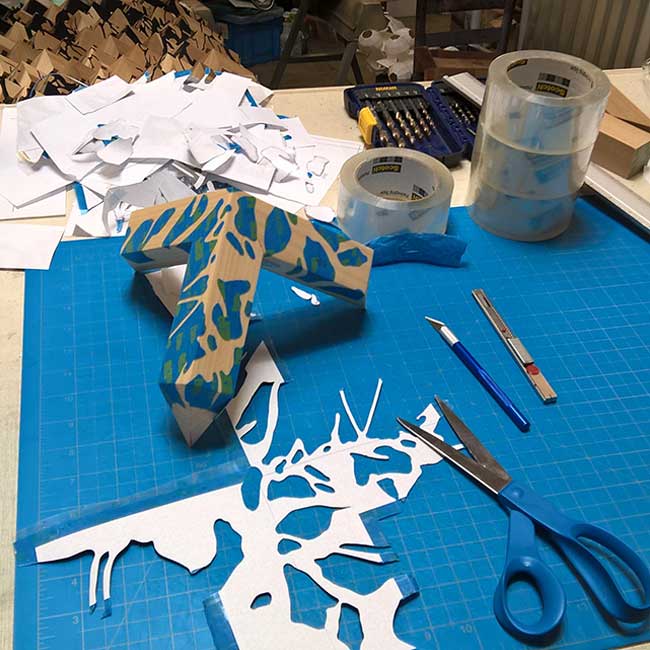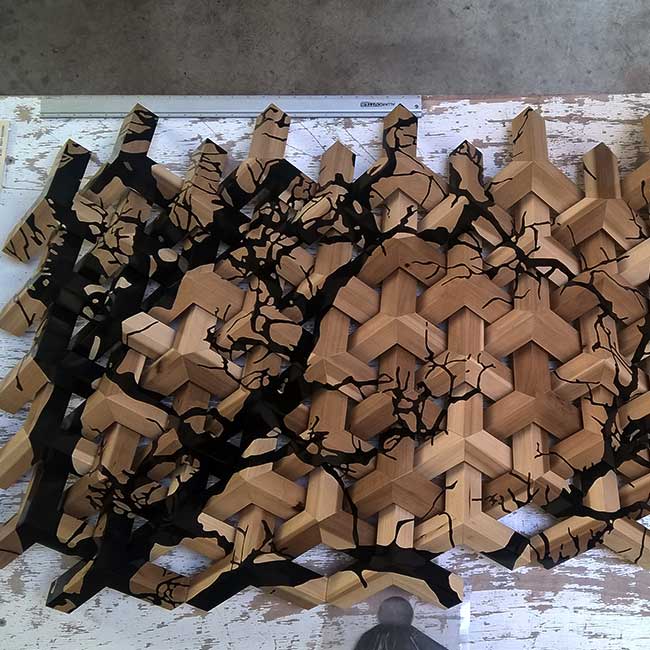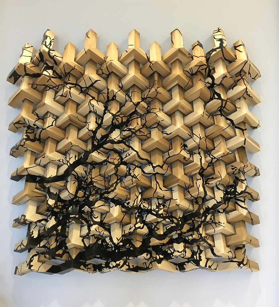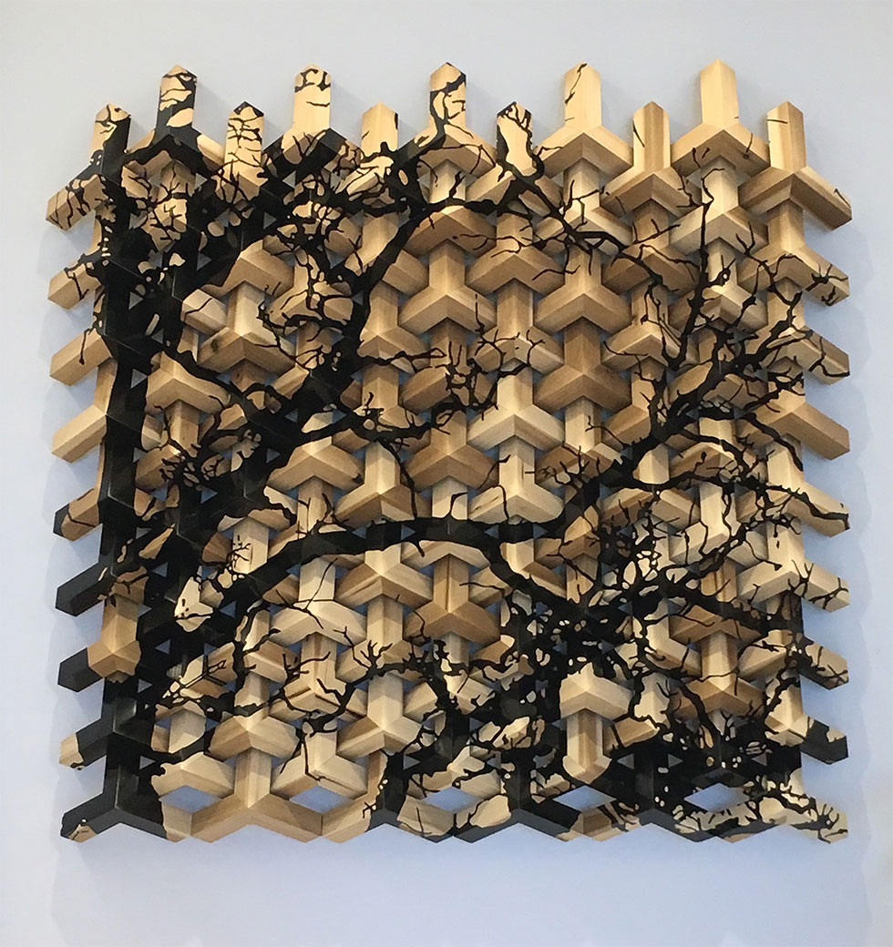 These works are about the opposing relationships of pattern vs. chaos and focus and vs. abstraction. While the oak motif is clearly visible when viewed straight on and from a distance, it appears abstract when viewed up close or from the side.