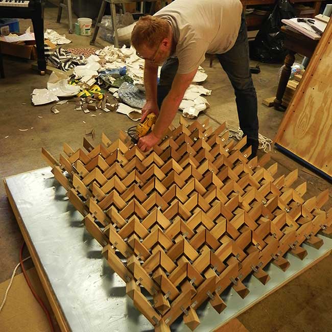 Image Source: facebook.com/rusty.scruby(b. 1964) Rusty Scruby is a contemporary Dallas artist known for cutting and weaving paper and photographs into mathematically precise constructions. He often uses music and mathematical configurations of waves in his fabrications. Most recently, he has been creating works with a wooden cube network.