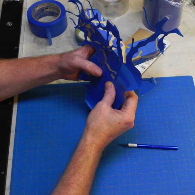 In a testament to Scruby’s ability to mathematically engineer his compositions, he did not paint the images on these sculptures after assembly, but on each tripod prior to assembling the whole.