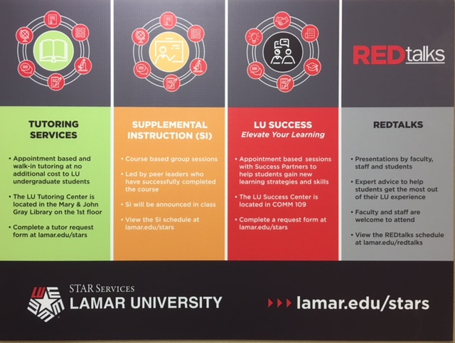 Welcome to Lamar University's Student Tutoring And Retention (STAR) Services. We invite you to explore our website and learn more about our programs and the people who are working every day to improve student experiences and student success at Lamar University. Feel free to call us at (409) 880-7201 or stop by our office in the Communication Building, Suite 109.