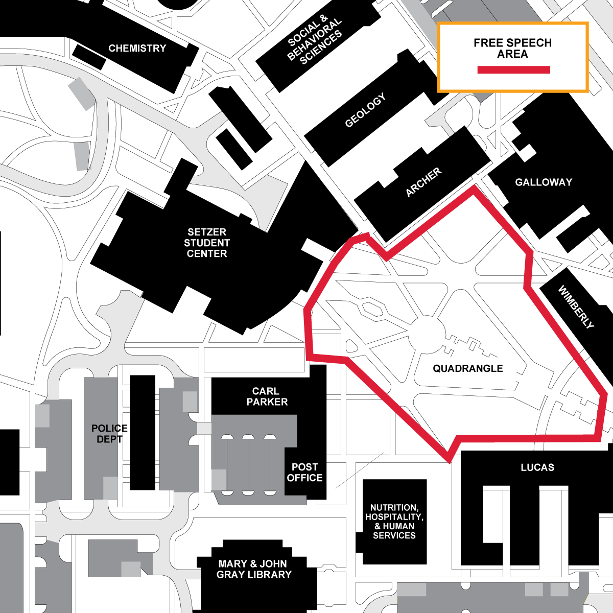 Designated Public Forum.The Quad sits at the center of campus between the Archer building to the north, Wimberly building to the east, the Setzer Student Center to the west and Lucas Engineering to the south. The Quad is designated as a public forum for the Expressive Activities of students, employees, and the general public subject to this policy.