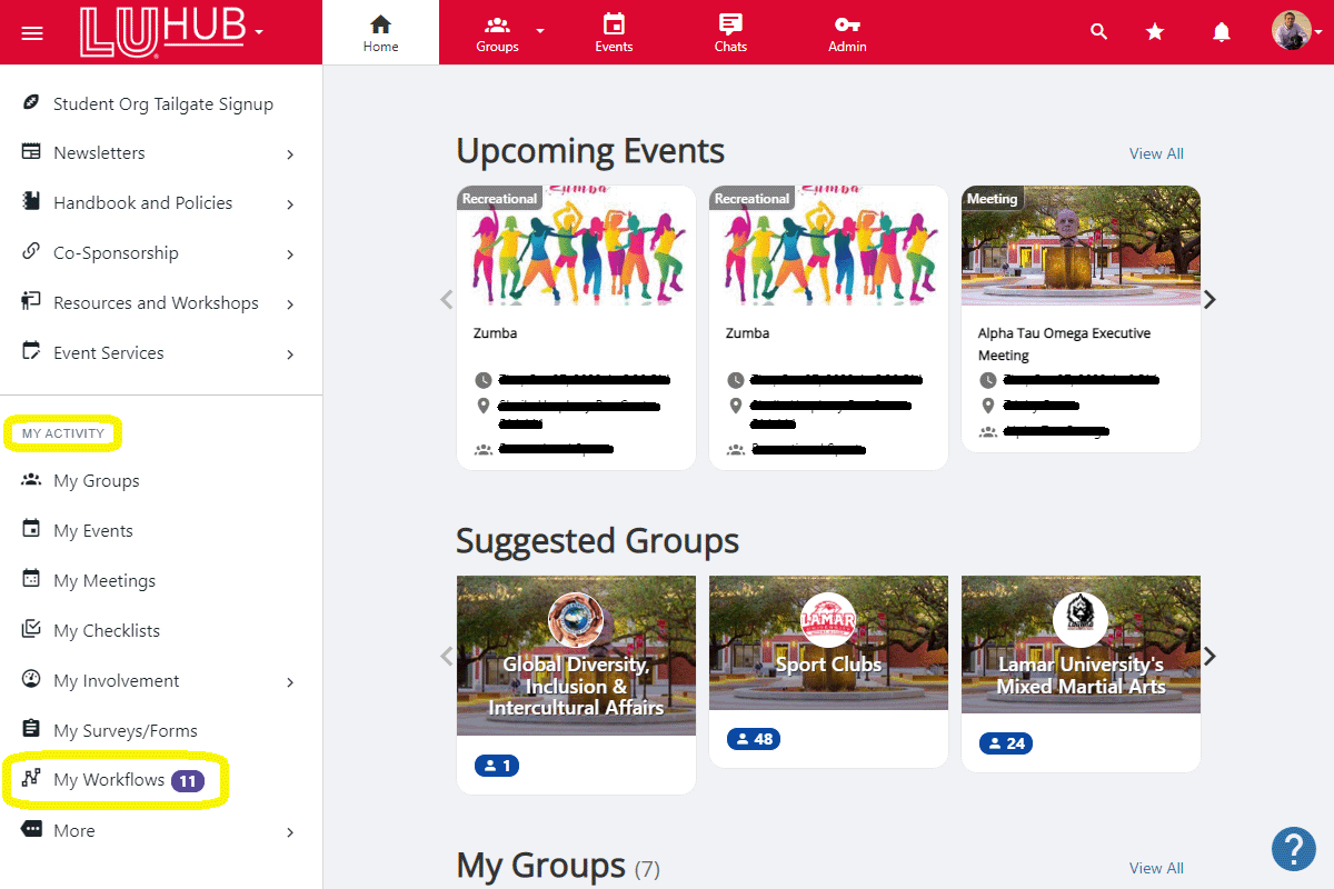 On the left menu, scroll down until you see the My Activity heading. Click My Workflows.