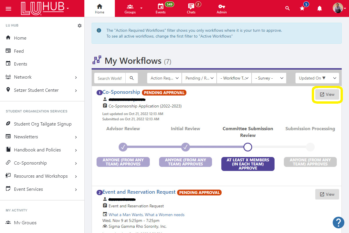 Here you will see all the workflows that are still pending action from you. Click View on the workflow you'd like to access.