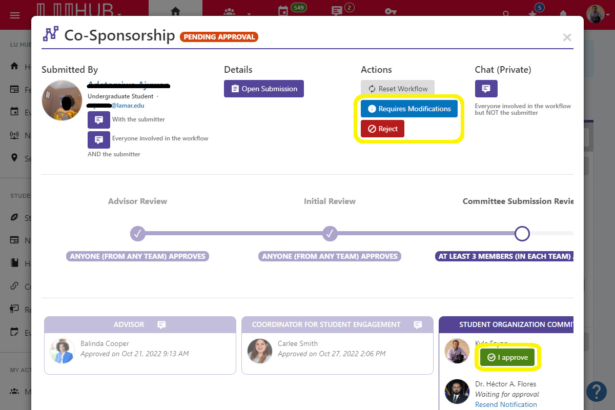 If you are not satisfied with the request, and feel it needs alterations, click Requires Modifications. This will allow you to send a message to the submitter and allow them to make changes to the current request.