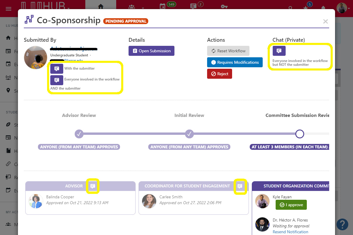 If needed, you can start a chat with any combination of individuals involved. To do so, click the appropriate chat icon.