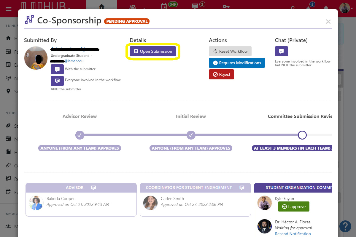 The workflow pop-up window will open. To view the details of the submission, click Open Submission.