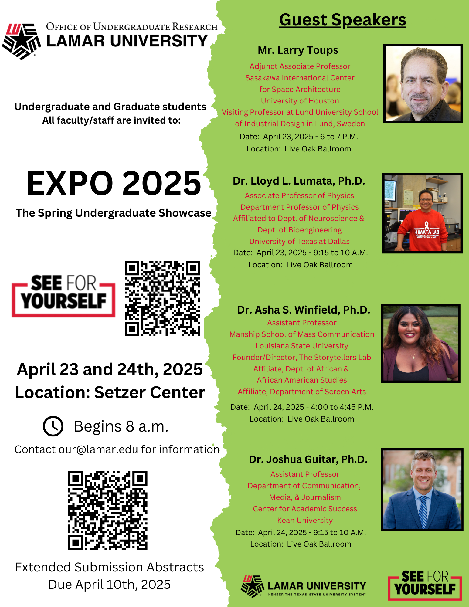 Join us this spring for an exhilarating celebration of knowledge and discovery at the EXPO. This event serves as a vibrant platform for showcasing the exceptional research endeavors of undergraduate scholars from diverse academic disciplines. Be prepared to immerse yourself in a world of cutting-edge ideas, interactive presentations, and engaging discussions, as we honor the dedication and intellectual achievements of our talented undergraduate researchers.