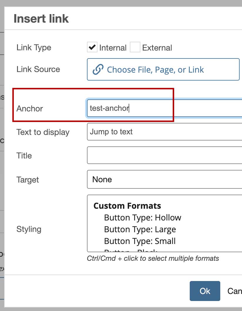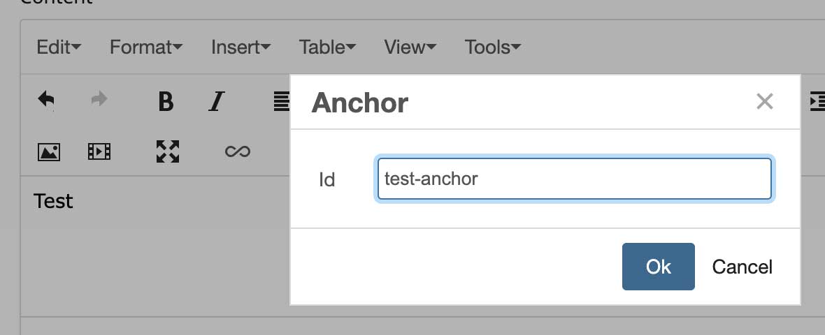 Type a short name for the anchor in the "Id" field, using dashes instead of spaces for longer IDs. ClickOK.